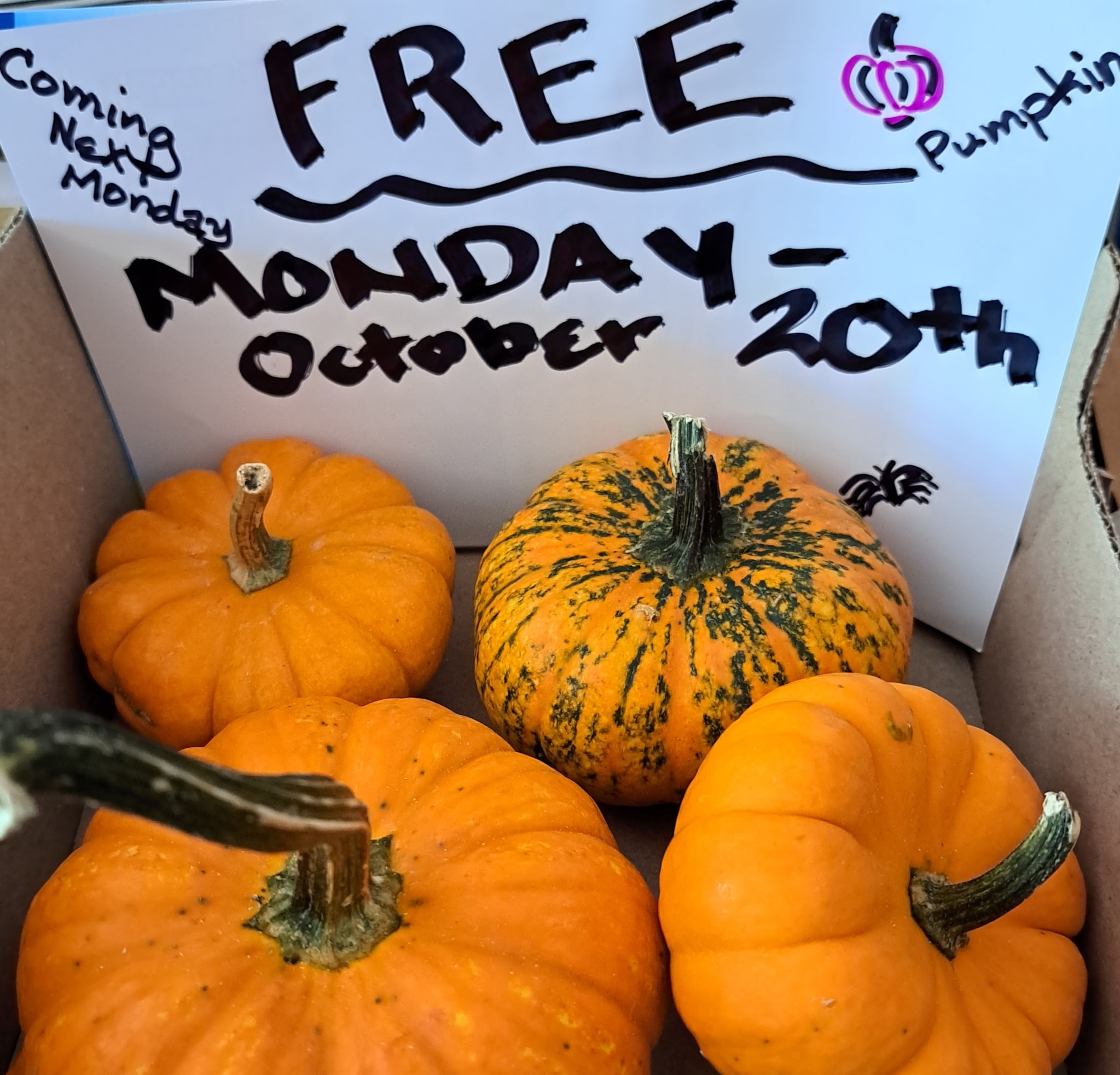 Please come to the Monday Pau Hana Market on October 20, 2025 between 3:00-5:00 pm for free Pumpkins while they last.